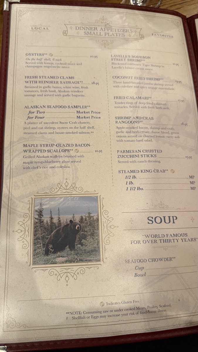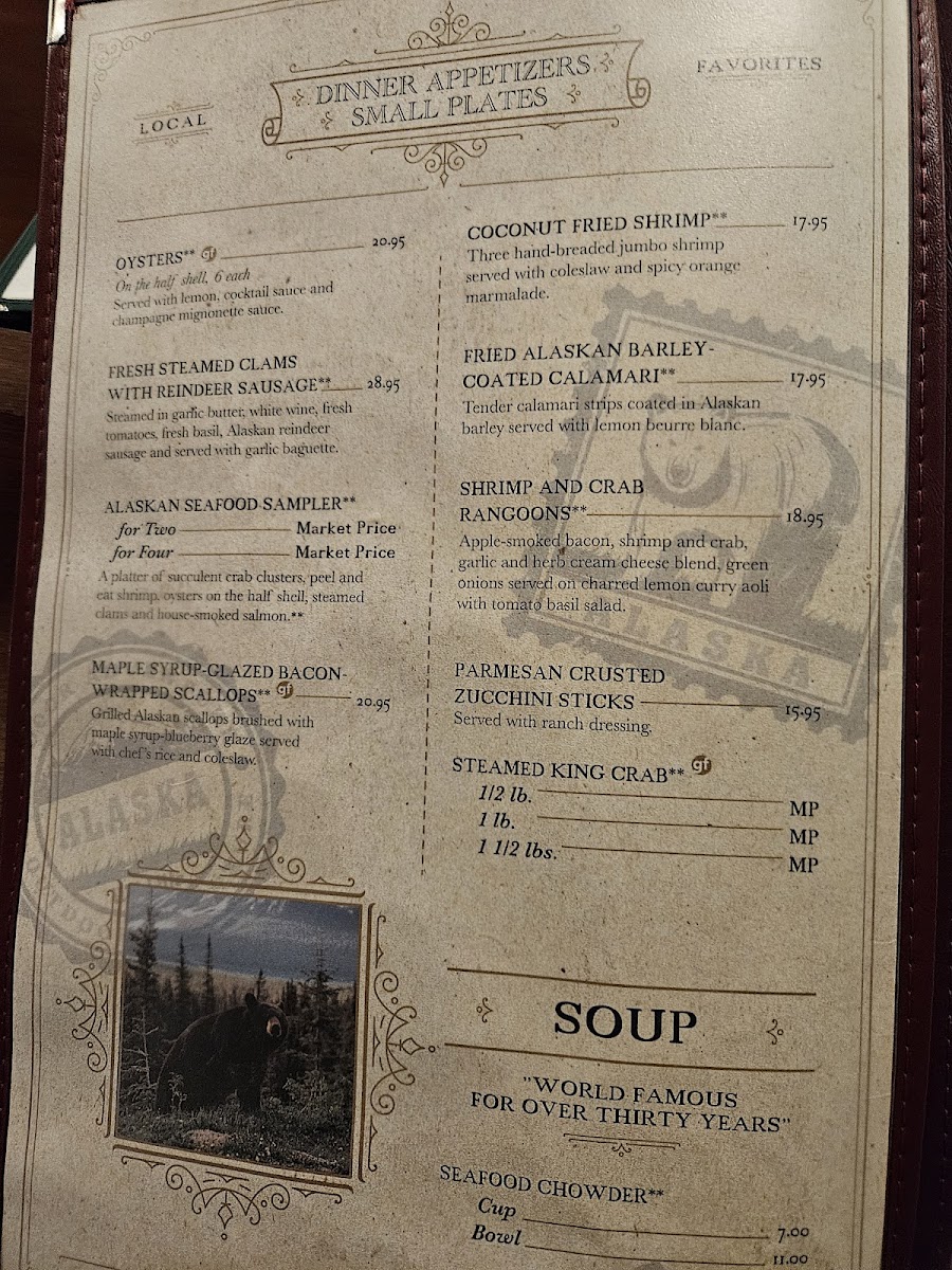 Guests can enjoy standout selections like the World Famous Seafood Chowder or a fresh and flaky Grilled Alaskan Salmon, ideal for those looking to savor local flavors. Alongside seafood, there are rich game options such as Elk Medallions and Lamb Chops, which complement the warm, old-saloon atmosphere filled with nostalgic décor and historic memorabilia.