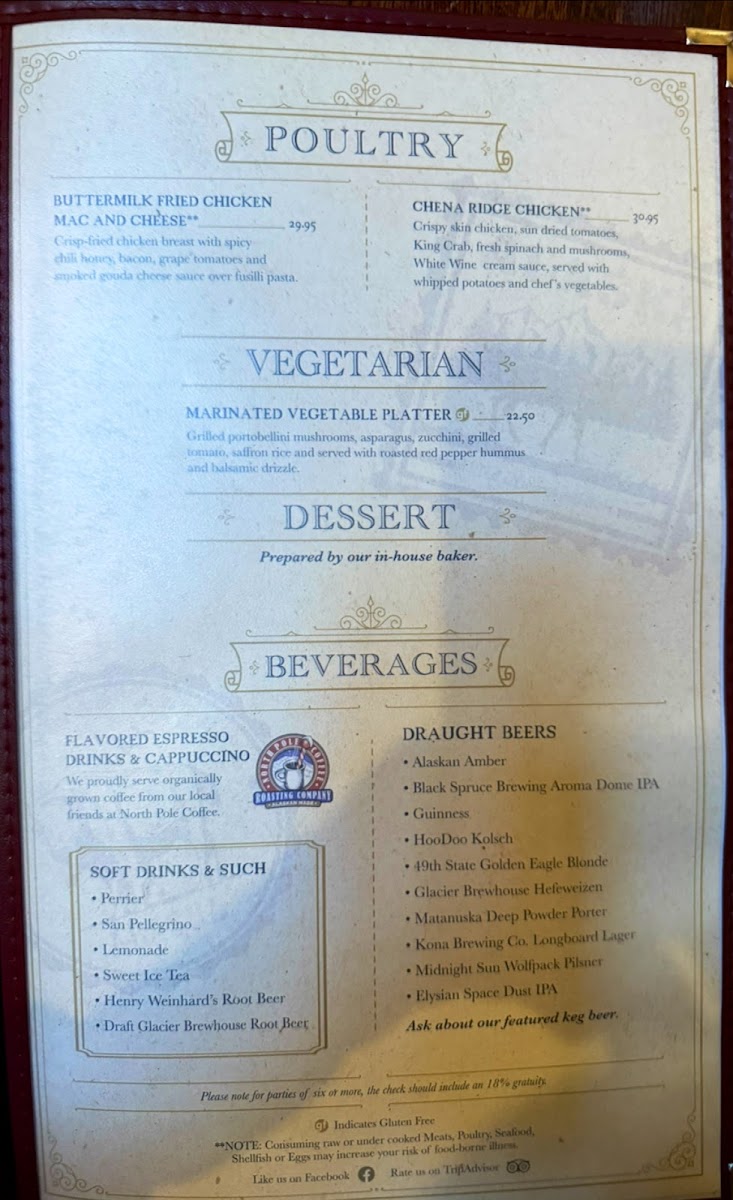 Whether stopping by for a casual bite with a cold Alaskan Amber beer or settling in for a full dinner featuring dishes like Seafood Risotto or Reindeer Medallions, the menu offers something for different tastes and occasions. Sweet finishes like Burnt Creme or a slice of Chocolate Lava Cake serve as understated comforts after a satisfying meal.